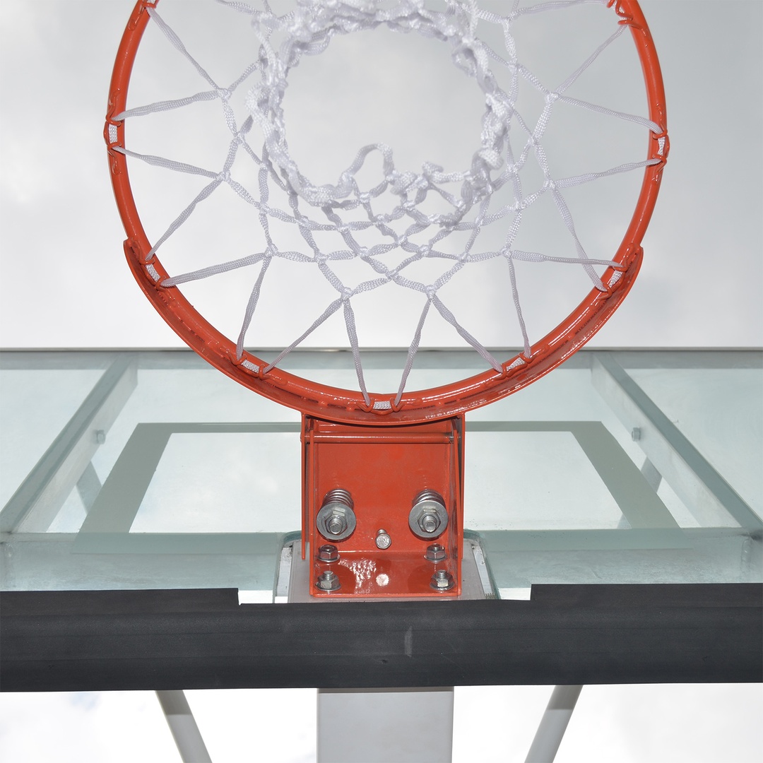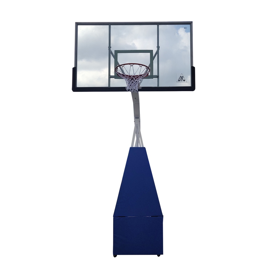 Баскетбольная мобильная стойка клубного уровня для установки в помещении. Баскетбольный щит размером 180х105 см из закаленного стекла толщиной 12 мм в алюминиевой раме.
