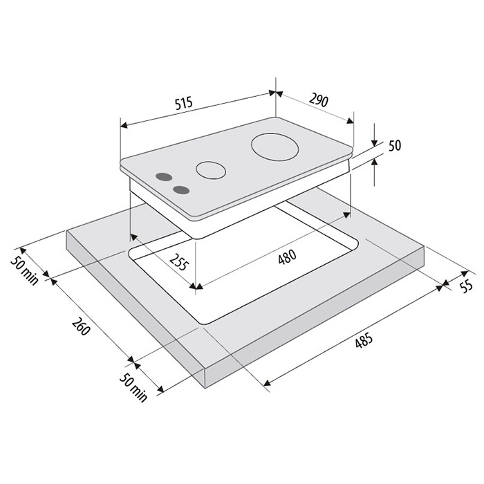 Автоматический электроподжиг. Газ-контроль. Ширина: 59.5 см. Глубина: 51 см. Размер ниши для встраивания (ШхГ): 56х48 см. Решетки эмалированные