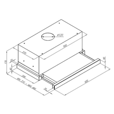 Телескопическая встраиваемая вытяжка цвета слоновой кости. Ширина вытяжки равна 60 см, производительность - 600 куб.м/час. Максимальный уровень шума, производимого вытяжкой, составляет 53 дБ.
