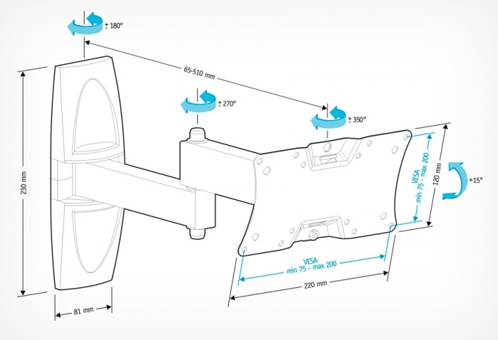 Функциональный кронштейн дает возможность менять угол наклона и поворота телевизора. Вы сможете смотреть телевизор с полным комфортом независимо от того, в каком месте комнаты находитесь. Такие кронштейны, например, идеально подходят для студий или для размещения в углу комнаты.