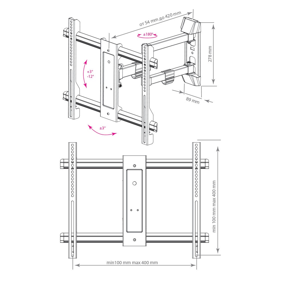 Назначение: для телевизоров. Тип установки: настенный. Регулировка: наклонно-поворотный. Диагональ экрана (дюймы): 22"-55" Диагональ экрана: 56-140 см. Расстояние от стены.