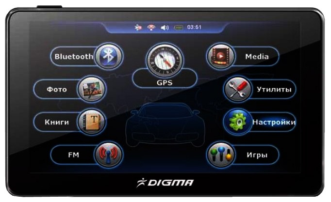 Digma DS600BN – стильный GPS-навигатор с огромным сенсорным 6-дюймовым дисплеем высокого разрешения и широким набором дополнительных функций. Благодаря наличию Bluetooth, FM-трансмиттера, мощного процессора с современной операционной системой, которая позволяет воспроизводить множество аудио и видео форматов, этот навигатор станет настоящим мультимедийным центром вашего автомобиля.