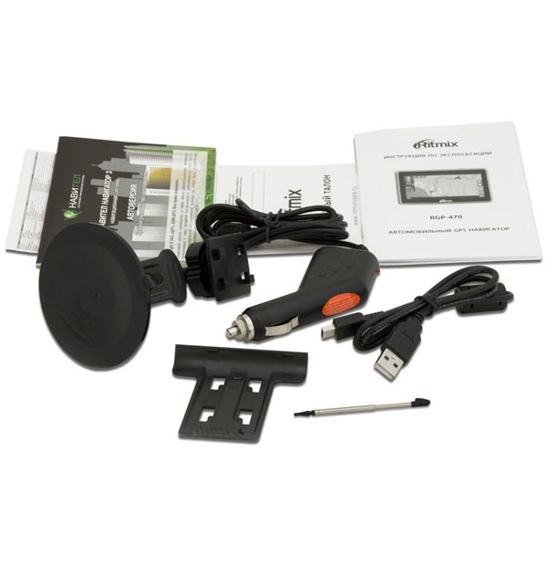 Емкость аккумулятора составляет 850 мАч. Автономная работа от батареи при активном использовании GPS достигает 3 часов. В комплект поставки Ритмикс RGP 470 входят все стандартные аксессуары — стилус, кабель для питания от прикуривателя, держатель на лобовое стекло, USB-кабель для синхронизации с компьютером и зарядки. Автомобильное крепление с вакуумной присоской надежно крепится к лобовому стеклу, позволяя легко снимать навигатор и столь же быстро помещать его обратно. При этом крэдл надежно фиксирует устройство, не позволяя ему упасть или болтаться при движении.