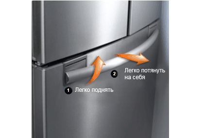 Открыть большую морозильную камеру проще простого. Специальная ручка сконструирована так, что достаточно слегка ее поднять, а затем потянуть на себя и камера легко откроется даже если она заполнена большим количеством тяжелых продуктов.