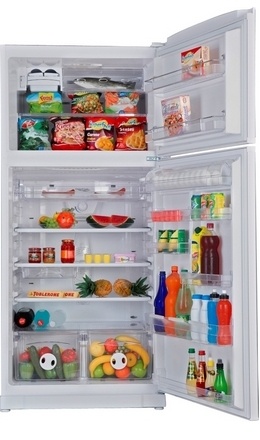 Отдельностоящий холодильник с верхним расположением морозильной камеры.