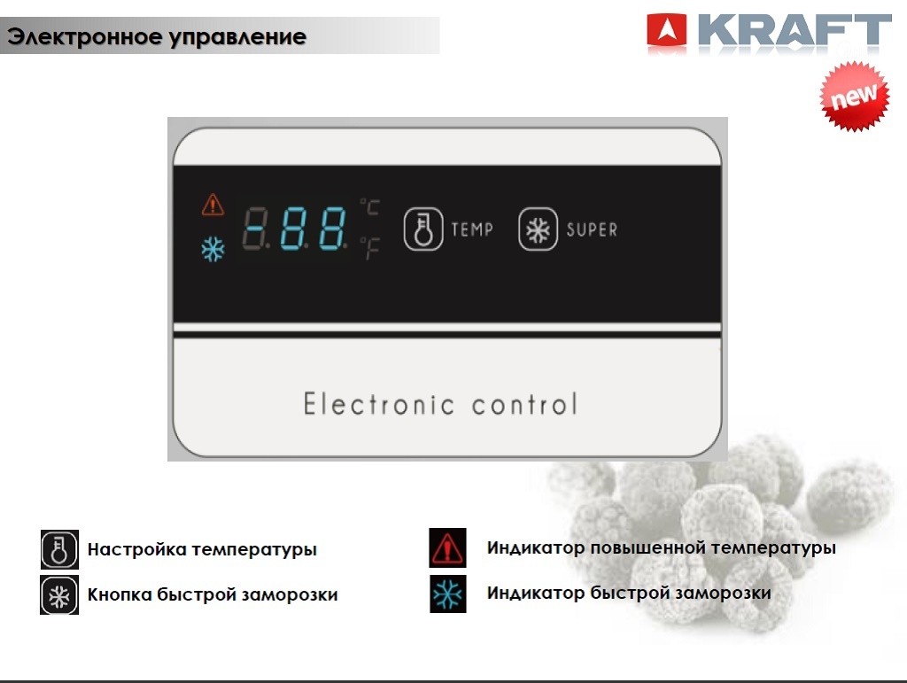 Новое поколение морозильных ларей KRAFT оснащенное LCD-дисплеем и электронным управлением, с инновационной конструкцией испарителя, обеспечивающей высокую эффективность охлаждения.
