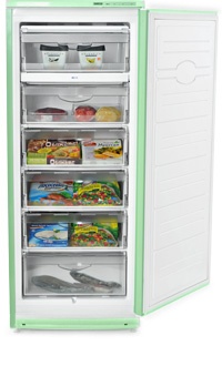 Особенности: большая вместительность при стандартных габаритах, простое и надежное механическое управление, режим «Быстрое замораживание», стабильная работа при перепадах напряжения в сети. Удобные пластмассовые корзины с боковыми ручками, поддон для замораживания ягод, пельменей и других мелким продуктов.