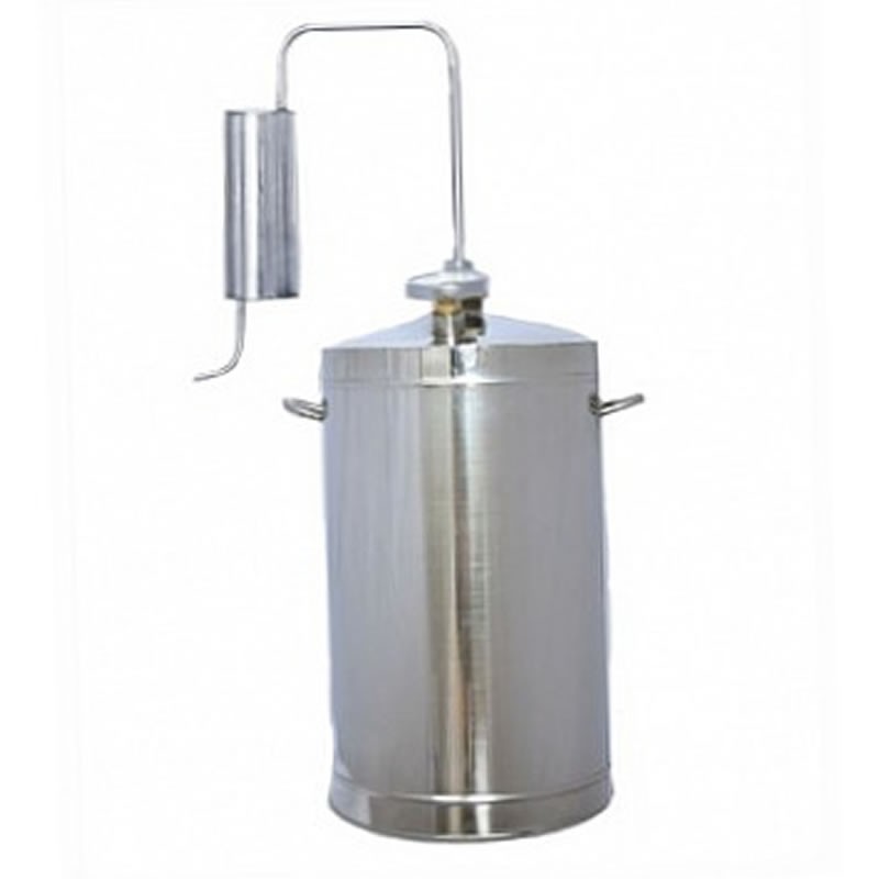 Модель работает следующим образом: из 20-литрового резервуара полученный пар поступает в охладительный куб, минуя при этом специальную стальную трубку. Этот дистиллятор справляется с перегонкой 2.5 литров жидкости за 60 минут. Внутри резервуара предусмотрен клапан, который срабатывает автоматически при избыточном давлении в приборе.