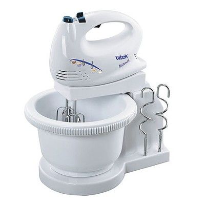 Миксер Vitek VT 1406 W получил мощный мотор с производительностью около 200 ватт. Модель работает на пяти различных скоростях, а также в турборежиме, при котором скорость вращения венчиков существенно вырастает. В комплекте идут две насадки – венчики и крюки для теста. В модели предусмотрено место хранения этих насадок.