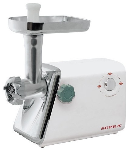 Доступная цена, симпатичный внешний вид и надежная работа – вот основные качества мясорубки Supra 1351. В комплект входит дополнительная насадка для приготовления кебабов. Металлический лоток поможет справиться с большим объемом работы, а во избежание повреждения пальцев предусмотрен толкатель. Все насадки, шнек и ножи сделаны из нержавеющей стали, а корпус – из пластика, что придает устройству надежность и элегантный вид, а чтобы прибор не подпрыгивал и не вибрировал в процессе работы, резиновые ножки надежно удерживают его на поверхности.