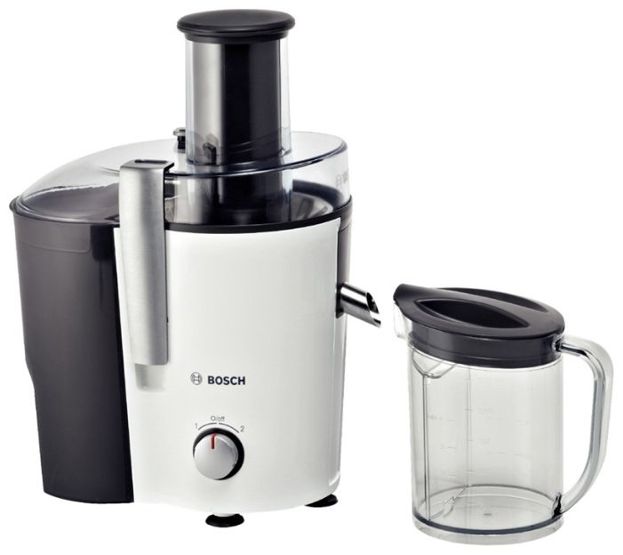 Соковыжималка Bosch MES 20A0 — удобная мощная модель с легким пластиковым корпусом и большой круглой горловиной, в которую можно помещать небольшие фрукты целиком.