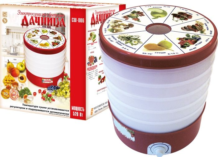 Особенность модели Дачница СШ-006 заключается в том, что она обеспечивает подачу нагретого воздуха, позволяя сохранить все питательные и полезные свойства продуктов. Температуру нагрева устройства вы сможете отрегулировать от 20 до 70 градусов при помощи специального переключателя. Благодаря функции защиты от перегрева вы не столкнетесь с внезапной поломкой сушки из-за длительной работы.