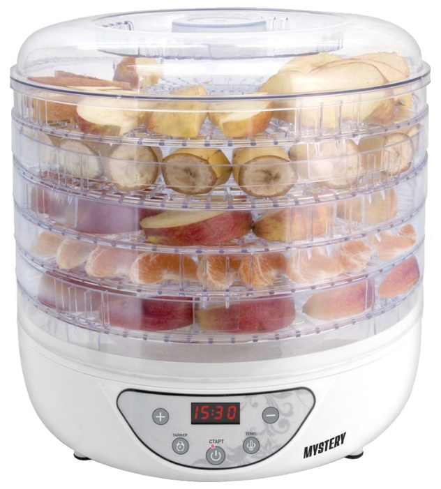 Возможность регулировки температуры позволит использовать модель и для приготовления сухариков, чипсов, а также вяленой рыбы и мяса в домашних условиях. К неоспоримым преимуществам сушки MYSTERY MDH-323 перед многими аналогами стоит отнести большую вместительность сушильной камеры из 5 поддонов, низкий уровень энергопотребления, а также наличие электронного таймера с дисплеем. Помимо этого модель работает очень тихо, поддоны легко собираются и моются.