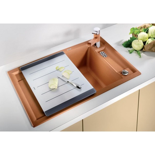 Основная чаша удобно расположена по центру. Разделочная доска из закаленного безопасного стекла плавно скользит вдоль всей поверхности мойки, что позволяет сбрасывать продукты после нарезки сразу в емкость, стоящую в чаше. Специальный профиль обеспечивает удобное и безопасное хранение доски и других кухонных принадлежностей. С правой стороны предусмотрена удобная и практичная дополнительная чаша небольшого размера с дополнительным стоком, который можно использовать для хранения губки для мытья посуды, сушки столовых приборов.