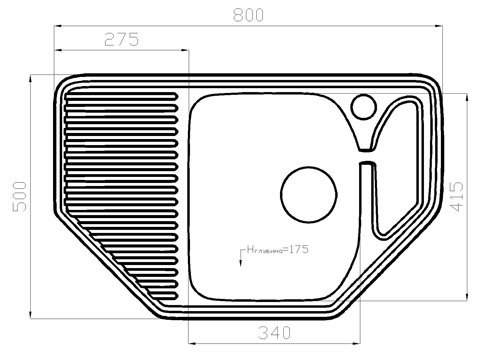 Внешние размеры: длина: 800 мм., ширина: 500 мм. Объем чаши: длина 340; ширина 415 мм; глубина 175 мм.
