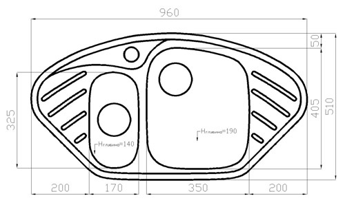 Внешние размеры: длина: 960 мм., ширина: 510 мм. Объем основной чаши: 350 х 405 мм; глубина 190 мм. Объем дополнительной чаши: 170 х 325 мм; глубина 140 мм.