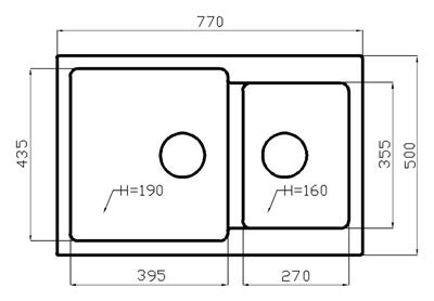 Внешние размеры: длина: 770 мм., ширина: 500 мм. Размеры основной чаши: 395 х 435 мм; глубина: 190 мм. Размеры дополнительной чаши: 270 х 355 мм; глубина: 160 мм.