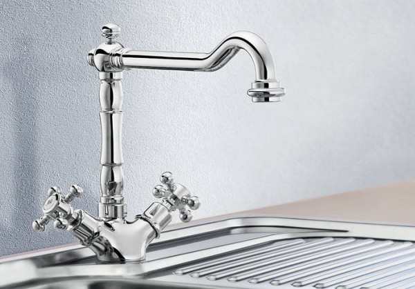 Классический двухрычажный смеситель оптимально подходит для кухонного интерьера в стиле кантри. Для смесителя обеспечена идеальная гармония с современными мойками из нержавеющей стали. Смеситель производится в исполнении нержавеющая сталь.