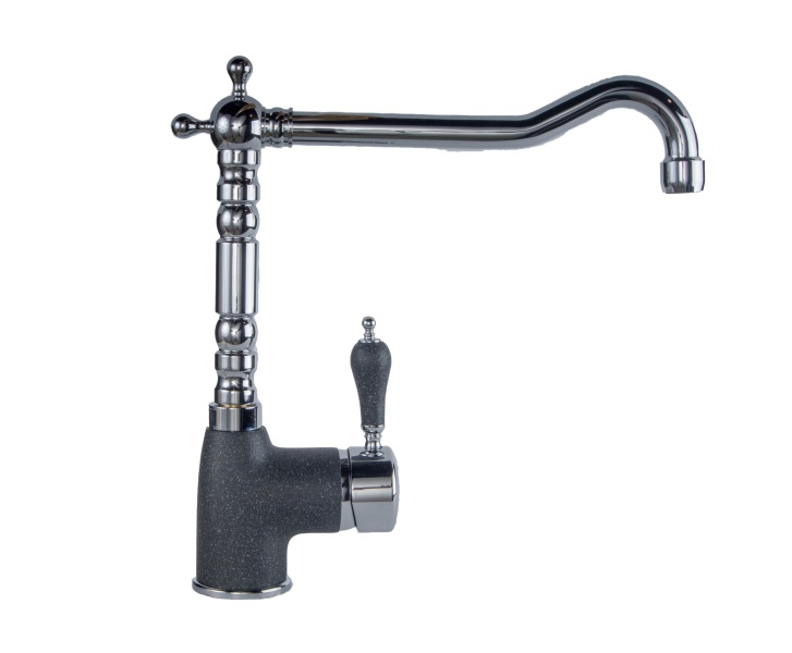 Однорычажный кухонный смеситель классического стиля комбинированного цвета, прекрасно сочетается с гранитными мойками и фурнитурой из хрома. Специальный картридж позволяет устанавливать смеситель практически вплотную к стене, с управлением рукоятки на себя.