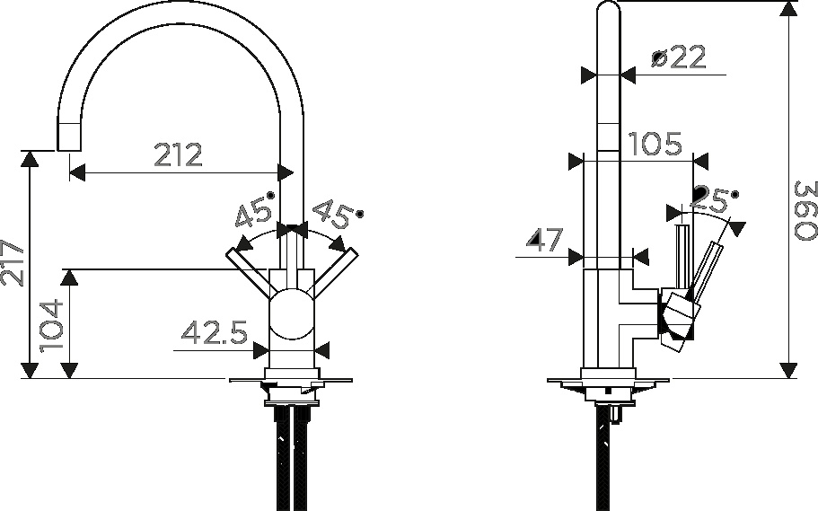 Тип смесителя однорычажный с доп. краном для питьевой воды. Материал: латунь. Цвет: вороненая сталь. Картридж: керамический ∅35 мм. Подводка: гибкая, в оплетке из нержавеющей.