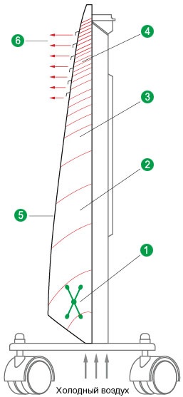 2. Конвекционная камера увеличенного размера 3. Сужение камеры для увеличения давления и нагнетения горячего воздуха 4. Быстрый выход нагретого воздуха через направляющие заслонки специальной формы 5. Низкая температура корпуса(передняя панель дистанцирована от нагревательного элемента) 6. Мощный поток горячего воздуха