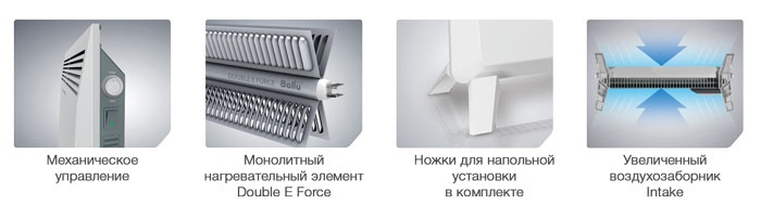 Высокая теплоотдача обеспечивается благодаря монолитному нагревательному элементу Double G-Force и увеличенному воздухозаборнику Intake. Высокий класс влагозащиты (IP 24) и датчик защиты от перегрева и система защиты при опрокидывании гарантируют прибору стабильную и безопасную эксплуатацию.