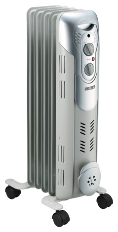 Масляный радиатор Mystery MH-5001 способен обогреть комнату до 15 квадратных метров. Этот процесс происходит благодаря 5 секциям с особенной масляной жидкостью в них и мощности в 1000 Вт.