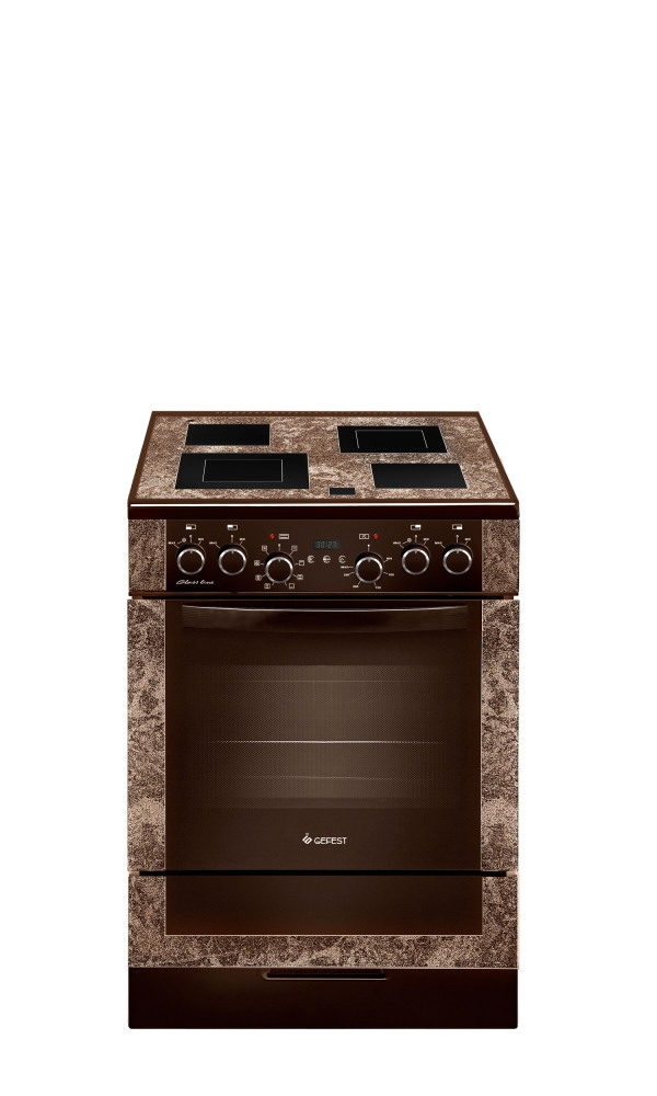 Цвет коричневый с рисунком "мрамор", варочная поверхность - стеклокерамическая.