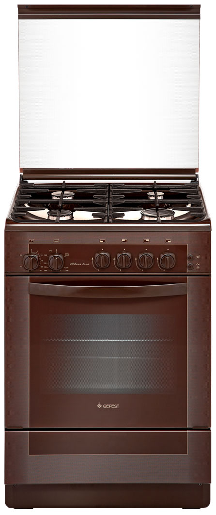 Коричневый эмалированный фасад, стеклянная крышка. Особенности. Чугунные решетки. Таймер электронный. Газ-контроль горелок стола. Газ-контроль духовки. Встроенный в ручки.