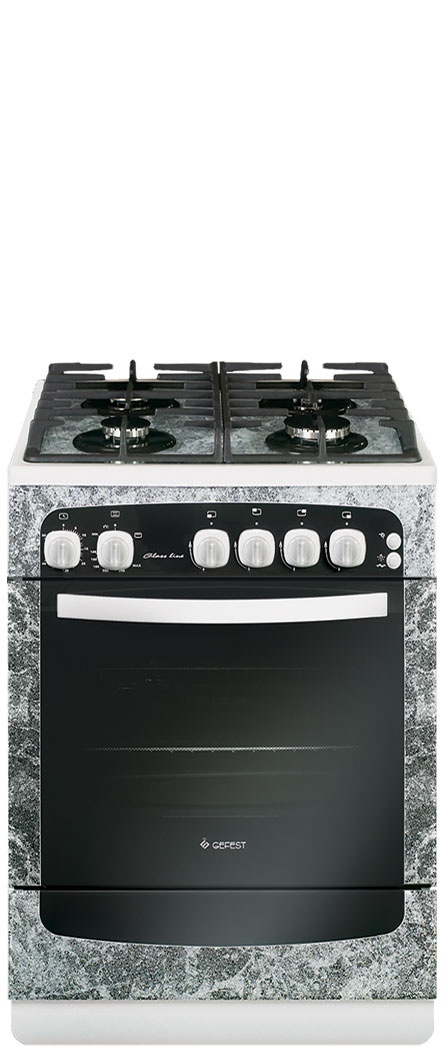 Фасад стеклянный коричневый с растровым рисунком. Особенности. Чугунные решетки стола. Таймер электронный. Встроенный в ручки управления электрозжиг горелок стола.