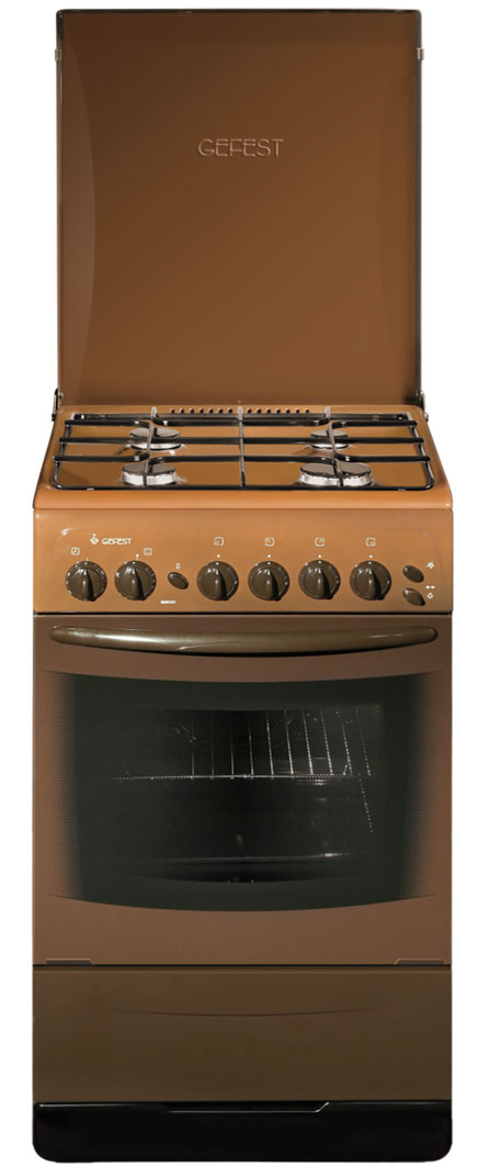 Коричневый эмалированный фасад, стеклянная крышка. Особенности. Чугунные решетки. Таймер электронный. Газ-контроль горелок стола. Газ-контроль духовки. Встроенный в ручки.