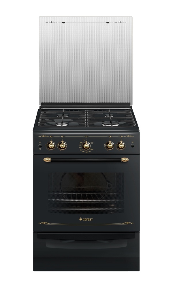 Крышка: стеклянная Габаритные размеры (ШхГхВ): 60x60x85 см. Объем духовки: 52 л. Чугунные решетки. Электророзжиг. Газ-контроль духовки. Съемные проволочные направляющие.