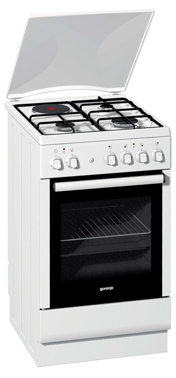 Gorenje KN52160AW1 - плита комбинированного типа. Ее варочная поверхность снабжена одной электрической (чугунной) и тремя газовыми конфорками, что особенно удобно в случаях, если есть возможность отключения электроэнергии или подачи газа. Газовые конфорки снабжены электроподжигом и эмалированными решетками.