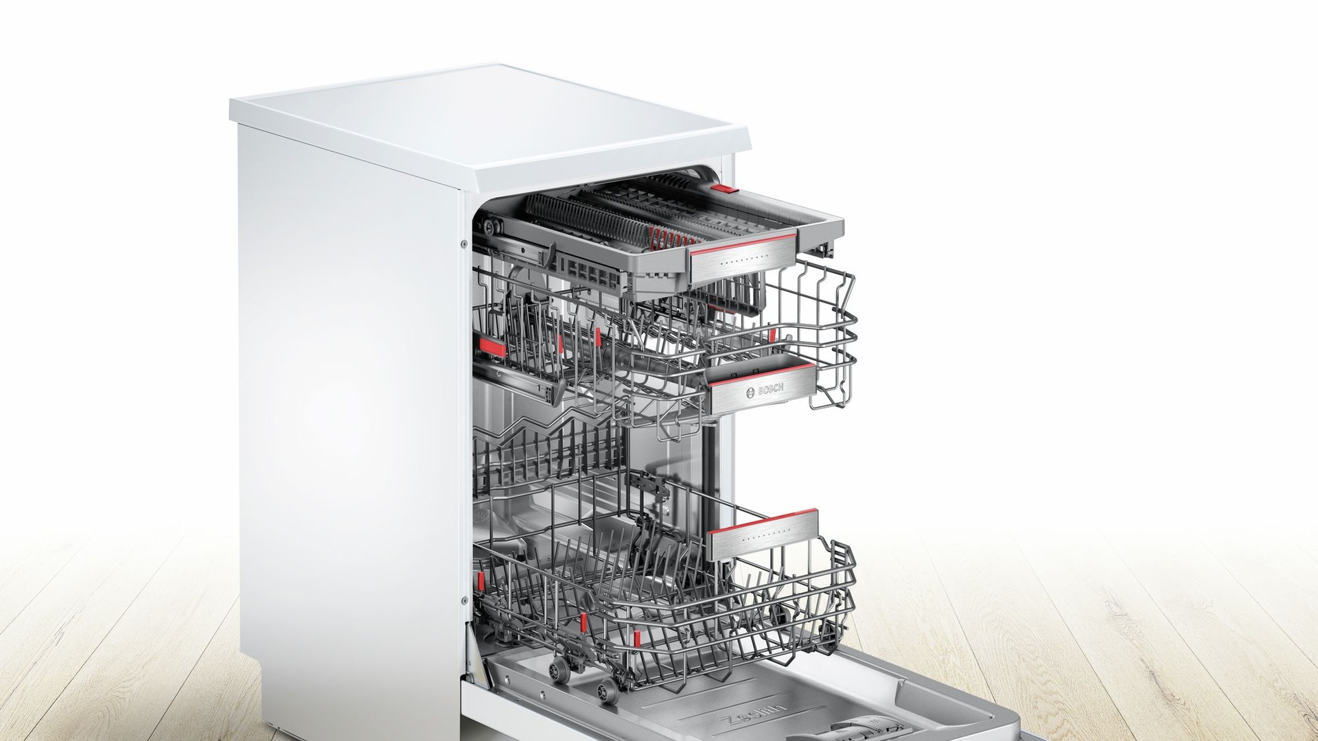 Узкая отдельностоящая посудомоечная машина cбережет драгоценное время и поместится даже на небольшой кухне. Пять уровней распределения воды обеспечат превосходный результат мытья.