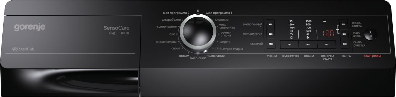 | Специальные программы | Био / Мои программы / Ночная стирка / Суперчерное / Спорт / Хлопок 30°С – 17 минут / Хлопок 20°С |