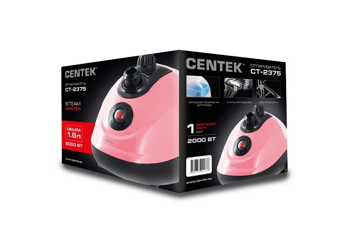 Модель Centek CT-2375 оснащена 1.5-литровым резервуаром для воды, которая нагревается до максимальной температуры за считанные секунды. За удобство во время эксплуатации отпаривателя отвечает 1.7-метровый сетевой шнур, а также трубка с телескопическим механизмом, обеспечивающим возможность регулировки ее длины.