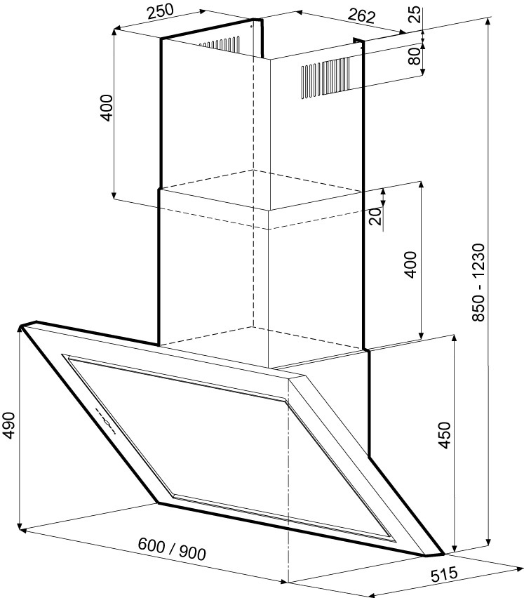 Каминная вытяжка наклонная монтируется к стене отвод /циркуляция для стандартных кухонь ширина для установки 60 см мощность 210 Вт электронное управление бесшумный.
