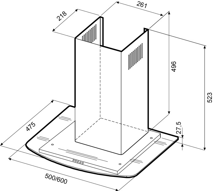 Каминная вытяжка наклонная монтируется к стене отвод /циркуляция для стандартных кухонь ширина для установки 60 см мощность 210 Вт электронное управление бесшумный.