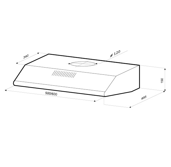 Ширина: 600 мм. Диаметр воздуховода: 120 мм. Производительность (м3/ч) max: 500 Управление: кнопочное. Количество скоростей: 3 Количество моторов: 1x185 Вт. Уровень шума, дБ.