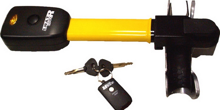 Механический блокиратор руля автомобиля со встроенным детектором вибрации, сиреной и строб-вспышкой. Пульт ДУ для постановки/снятия с охраны. Сирена - 125ДБ. В комплекте 2 ключа с повышенной секретностью.