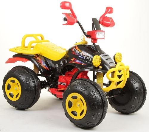 Такой квадроцикл непременно подарит вашему ребенку много радостных и положительных моментов. Если нажать на педаль, он тронется в путь, отпуская педаль, останавливается, может ехать как вперед, так и назад. Работает квадроцикл от аккумуляторной батареи. У него надежный ход, он оснащен устойчивыми колесами, развивает скорость около 7 км/ч. Также квадроцикл имеет хорошее посадочное место, световые и звуковые эффекты, два зеркала заднего вида, максимальная нагрузка около 50 кг.