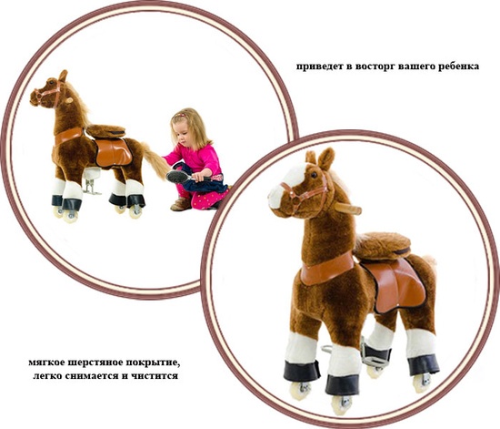 Во время игры не оставляйте ребенка без присмотра и по необходимости придерживайте его. Следите за тем, чтобы руки ребенка или предметы не попали между корпусом игрушки и седлом. Вся поверхность лошадки изготовлена из мягкого плюша. Мех легко снимается и при необходимости его можно почистить.