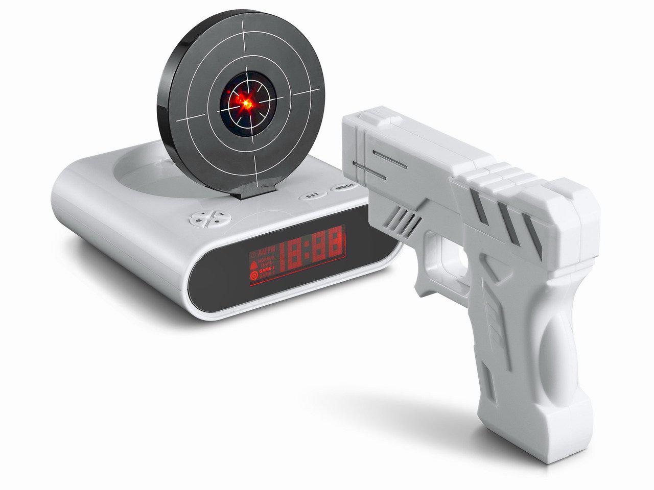 При включении сигнала, поднимается мишень и будильник не выключится до тех пор, пока вы не попадете в мишень из специального пистолета. Часы с мишенью имеют два режима игры: случайный режим, при котором мишень необходимо поражать при ее появлении через случайные интервалы времени и быстрая стрельба - необходимо поразить мишень 5 раз в течение 3-х минут. Так же вы можете записать свои собственные мелодии и использовать их в качестве звонка будильника.