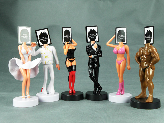 Необычные рамки выполнены в виде фигурок Мерилин Монро, Джеймса Бонда, стриптизерши и т.д. Просто вставьте фотографию на место головы и ваш друг предстанет в образе Джеймса Бонда и т.д. Благодаря небольшим размерам, для фигурки-рамки найдется место даже на рабочем столе.