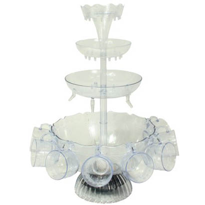 Фонтан оборудован внутренней подсветкой, которая создаст исключительный эффект на вечернем мероприятии. Ваш напиток (алкогольный или безалкогольный) подается из нижней чаши в верхний ярус, затем каскадом льется вниз с одного уровня на другой через отверстия по краю каждого яруса. Это создает потрясающий эффект водопада! Гости будут наливать напиток, льющийся тонкими струями в 8 чашек, имеющихся в комплекте и получать удовольствие не только от напитка, но и от такого способа его «подачи».