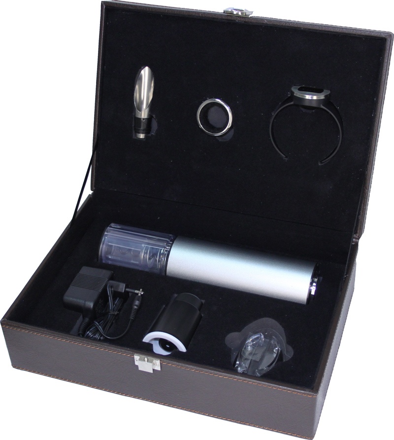 Набор может стать оригинальным и практичным подарком на любой праздник для близких и коллег - особенно владельцев домашних баров и винотек, также будет очень полезен в барах и ресторанах. Набор помещен в стильную подарочную коробку. В наборе: автоматический электрический штопор, нож для снятия пленки вокруг горлышка, ободок-каплеулавливатель, термометр, помпа-заглушка, насадка для горлышка бутылки и адаптер питания для штопора. Все эти аксессуары помогут сделать процесс подготовки и хранения вина более увлекательным. Питание электрического штопора от встроенного аккумулятора.