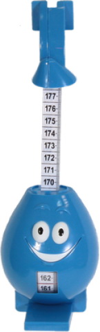 Устройство предназначено для быстрого и удобного измерения роста ребенка. Измеритель выполнен в виде симпатичной голубой капельки с лицом и будет радовать вашего малыша. Ребенок с удовольствием будет проходить процедуру измерения роста. Устройство прикрепляется на стену или дверной косяк, на высоте 182 сантиметра от пола. Незакрепленная часть прибора (с рожицей) опускается вниз до касания головы ребенка, а рост (в сантиметрах) автоматически появляется в окошке на корпусе измерителя.