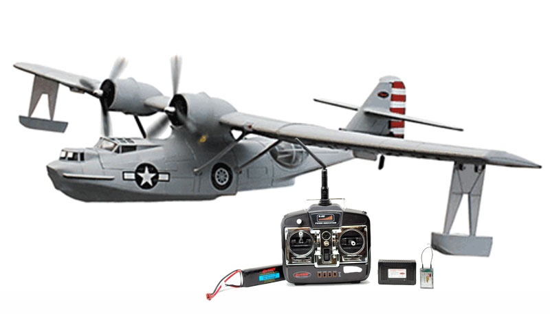 Модель морского патрульного бомбардировщика амфибии Consolidated PBY Catalina, она оснащена двумя бесколлекторными электродвигателями, аппаратурой управления 2.4GHz и аккумулятором с зарядным устройством!