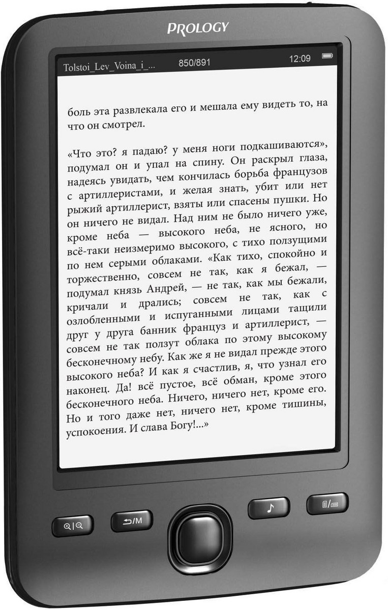 Модель электронной книги Prology Latitude I-601 поражает своим изяществом и стильным дизайном тонкого корпуса. 6-дюймовый экран, выполненный на базе технологии электронных чернил E-Ink и имеющий разрешение 800x600, обеспечивает отличную четкость и качество изображения. При этом вы можете быть абсолютно спокойны за сохранность вашего зрения. Вся навигация по книжке осуществляется с помощью 5-ти кнопок, расположенных внизу передней панели. На верхней грани устройства находятся индикатор работы и кнопка вкл/выкл. На нижней грани сосредоточены все остальные разъемы, в том числе слот для карт памяти MicroSD.