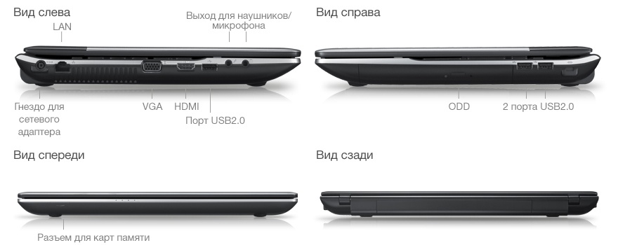 | USB 2.0x3, VGA (D-Sub), HDMI, вход микрофонный, выход аудио/наушники, LAN (RJ-45) | |